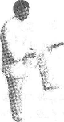 陈式太极拳式之一。以两臂的顺逆缠丝劲使身体旋转而起,呈右独立步,再合劲两掌向前按下,头要上领,气沉丹田。如图。