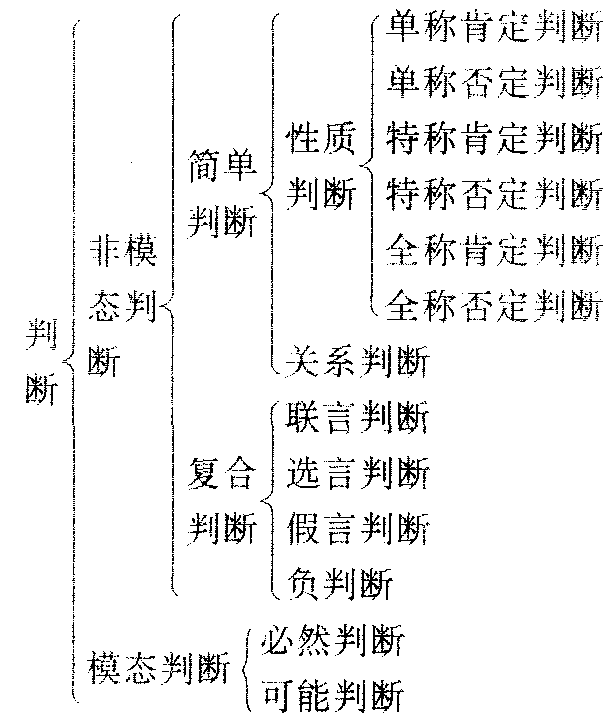 判断和语句的关系。判断是语句表达的思想内容;语句是判断的语言表达形式。判断和语句的主要区别表现在:判断是思维形式,语句是语言形式, 二者各属不同的对象领域,各属不同的科学范畴。判断和语句不是一一对应的,同一判断可用不同语句表达,同一语句可表达不同判断。判断都通过语句表达,但并非所有语句都表达判断。直陈句都表达判断。疑问句(不含反问句)、祈使句和一般感叹句不表达判断,但带有感情色彩又对事物情况有所断定的句子表达判断,如:“黄山真美呀!”对判断的分类,从古至今尚无定论。上表是其中的一种分类方法。