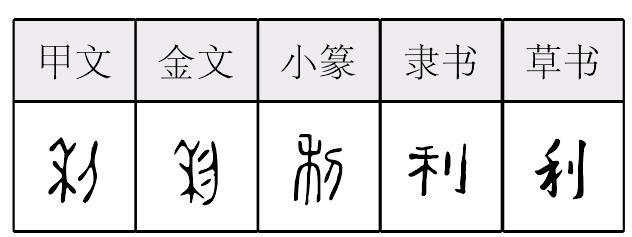 【提示】禾,中间是竖,不是竖钩; 位于字左时,末笔捺改点。 *利lì7画 禾部 (1) 锋利;锐利(和“钝”相对): ~剑|~爪。 (2) 顺利: 形势不~。 (3) 利益(与“弊”“害”相对): 兴~除害|权衡~弊|~令智昏。 (4) 使有利: ~国~民|~己主义。 (5) 利润或利息: ~率|高~贷|薄~多销|一本万~。 利 ☚ 剴 剡 ☛ 利lì甲骨文从刀旁有几点,象碎屑。表示刀锋利。其后加禾旁,或者点形,表示刀割禾锋利。晚期有上加又(手),下加土旁的,表示手揪禾,刀锋利。西周金文、战国文字还有加点的。《说文》所载战国文字略讹,似从禾从“勿”。本指刀口快。如:利刃|利剑。引申指其他事物。如:利口(比喻善辩)。组词如:利落|利索。都是爽快、整齐义。刀快收获好,显示吉。又指顺利。如:不利于敌。引申为好处。如:有利。组词如:利益|利害。转为动词,使得到好处。如:毫不利己。组词如:利用。后指利息,利润。如:本利两清|高利贷。 利★常◎常
