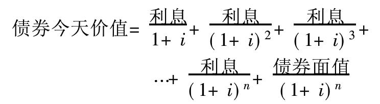 3. 息票债券。每年向债券持有者支付定额的利息(息票利息),直至到期日再偿还债券的票面金额。未来各年息票利息支付额的现值与最后偿还的债券面值的现值之和,要等于债券今天的价值。可记为: