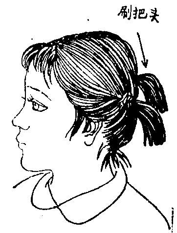 (名)女孩子扎成两束的短发,状如刷把,故名:有梳了发辨的,有扎着~的,也有才留着马桶盖的。(风78)