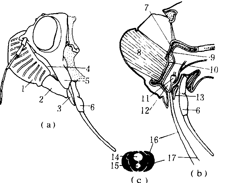 | 释义 | 刺吸式口器piercing-sucking mouth-parts能刺破动植物组织并从中吸取汁液的一类口器。上颚及下颚的一部分为细长的口针,下唇延长成喙。食窦与咀嚼式口器部位相同,只是扩大成筒状,并有强大的背扩肌,借以形成抽吸液体食物的唧筒。唾管端部形成唾唧筒,为同翅目、半翅目及一部分双翅目昆虫所特有。蝉的口器具有代表性(见图),上唇锥形,狭长,内壁凹入,紧贴于喙的基部,上颚口针较粗,针端有齿,是刺入寄主组织的构造; 下颚口针由内颚叶演变而成,内壁有两个槽,两口针相合分别形成食物道和唾道,其外侧壁突出处与上颚口针的沟槽相嵌合(图c);外颚叶退化呈剑状,位于茎节端部,不外露,茎节并入头壳,称为下颚叶; 下唇喙分3节,其前壁凹成槽,全部口针藏于槽中,下唇须消失; 舌短,锥状,前壁凹陷与食物道连接,并通入食窦唧筒,舌后面扩展为两大翼片,形成口针囊后壁,舌后侧面扩展至下颚和唇基之间,为舌侧片。唇基非常发达,分为前、后两部,后唇基占头部正面的大部,为食窦唧筒提供强大的背扩肌(图b)。唾唧筒杯状,唾道穿过舌。口位于食窦唧筒之后,功能的“口”则前移到唧筒的入口处。取食时,两上颚口针交替刺入组织,下颚口针跟随而下。食窦唧筒将寄主汁液抽吸入食物道后进入消化道。蓟马的刺吸式口器以有不对称上颚为特点,上唇、下颚的一部分及下唇组成短小的喙,内藏有左上颚(右上颚常退化或消失)和一对下颚形成的3根针,舌位于喙的中央。上颚口针基部粗大,是主要的穿刺工具,两下颚口针组成食物道,舌与下唇组合成唾道。下唇为宽三角形,形成喙的后壁,下唇须短,分2节。口位于上唇基部之后。取食时,头部上下动活,口针刮破寄主组织并插入其中,汁液流出后吸入食物道。所以蓟马的口器也被称为剉吸式口器。