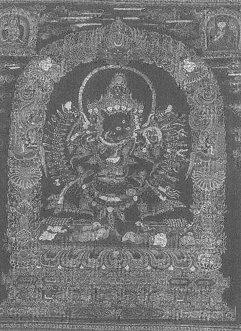 明。刺绣。纵79厘米,横62厘米。西藏自治区拉萨市布达拉宫藏。此幅唐卡画的是文殊菩萨化身的大威德怖畏金刚像。大威德怖畏金刚是西藏佛教密宗的本尊。密宗教法云:“有伏恶之势,谓之大威,有护善之功,谓之大德,”大威大德故名大威德。有明王中之大威德,有菩萨中之大威德,有迦楼罗王中之大威德。各种大威德,以其性德而名之。此像为玖洛扎瓦的本尊像。金刚站在由吉祥图案组成的基座上,周围是吉祥花卉及小佛组成的拱门。大威德怖畏金刚9头36臂,16足,每只手持一兵器,显示除恶的威慑力量。颈上有蛇逶迤盘绕,腰间用骷髅装饰,形象凶恶可怖。16足下,庇护着飞禽走兽及善良的人类。周围祥云缭绕,左右各有一佛对称于上方。刺绣,是唐卡的又一品种,它是用各色彩缎,剪裁成各种人物和图形,粘贴在织物上,故又称“堆绣”。此画即是用堆绣之法,表现其艺术水平的。