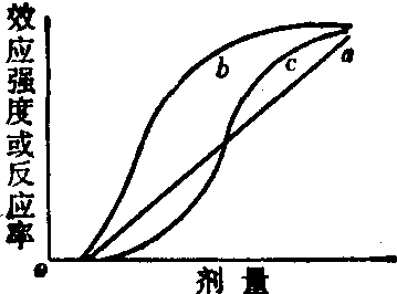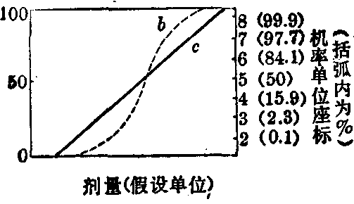 不对称S状曲线 (曲线α,剂量用自然数坐标)转换为对称的S状曲线(曲线b,剂量改用对数坐标) 对称的S状曲线 (曲线b,反应率用%)转换为直线 (直线c,反应率改用机率单位)