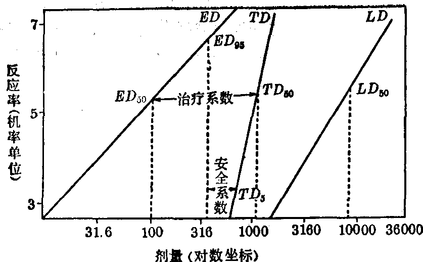 以下图为例,可以说明某化学物的治疗作用、毒性作用,致死作用三条剂量-反应曲线,一经化为直线(ED、TD、LD),即由此获得各自剂量中值(ED50、TD50、LD50)的指标。该化学物的ED50和LD50是它的不同生物效应的指标。从图可见到其治疗系数(TD50/ED50)的TD50高于ED50的10倍以上,表明该化学物用于治疗的安全性较大。但就群体中可能存在对毒作用的高敏感个体,而对治疗作用低敏感个体来说,为保护他们在治疗过程中不致中毒,应采用安全系数(TD5/ED95,必要时甚至按TD1/ED99)来衡量其安全性。