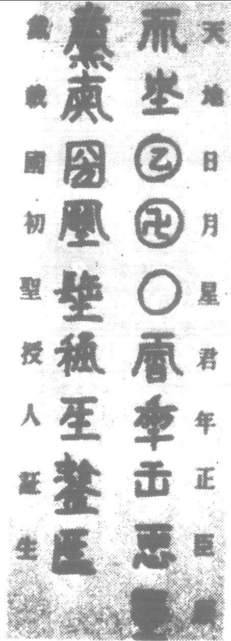 則天文字 (十九字) 則天武后篡奪唐祚,改國號曰周。嘗出己意,增减前人筆畫,自我作古,為十九字曰: “ (天) 埊(地) 𡆠 (日) 囝 (月)○ (星) (君) 𠦚 (年) (正)𢘗 (臣) 曌 (照) (戴) (戴) 圀 (國) (初) 𨭻 (證) (授)厓 (人) (聖)𠤵 (生)”(如圖)。光宅、垂拱、永昌年間 (684—689),武后臨朝稱制時,不見此“則天文字” 行世。天授元年(690) 稱帝後,臣下章奏與天下書契,咸用其字,然獨行一世而止。唐石刻載其字者,知其在則天時。萬歲登封元年(696)<封祀壇碑>、聖曆二年(699)<昇仙太子碑>等中皆有。日本後世板碑等亦多此迹。武周滅,“則天文字” 隨之廢絕。其創製無據,純屬主觀臆造,字形并不美妙。 |