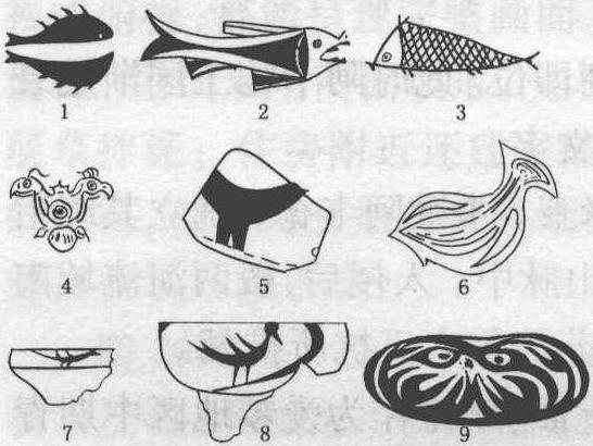 陶器上的各种动植物纹样 动、植物形态知识产生:在陶器、骨器上,绘刻有鸟、龟、蛙、鱼、鹿等动物以及植物叶子、豆荚和种子图案,形态生动、逼真(如图)。