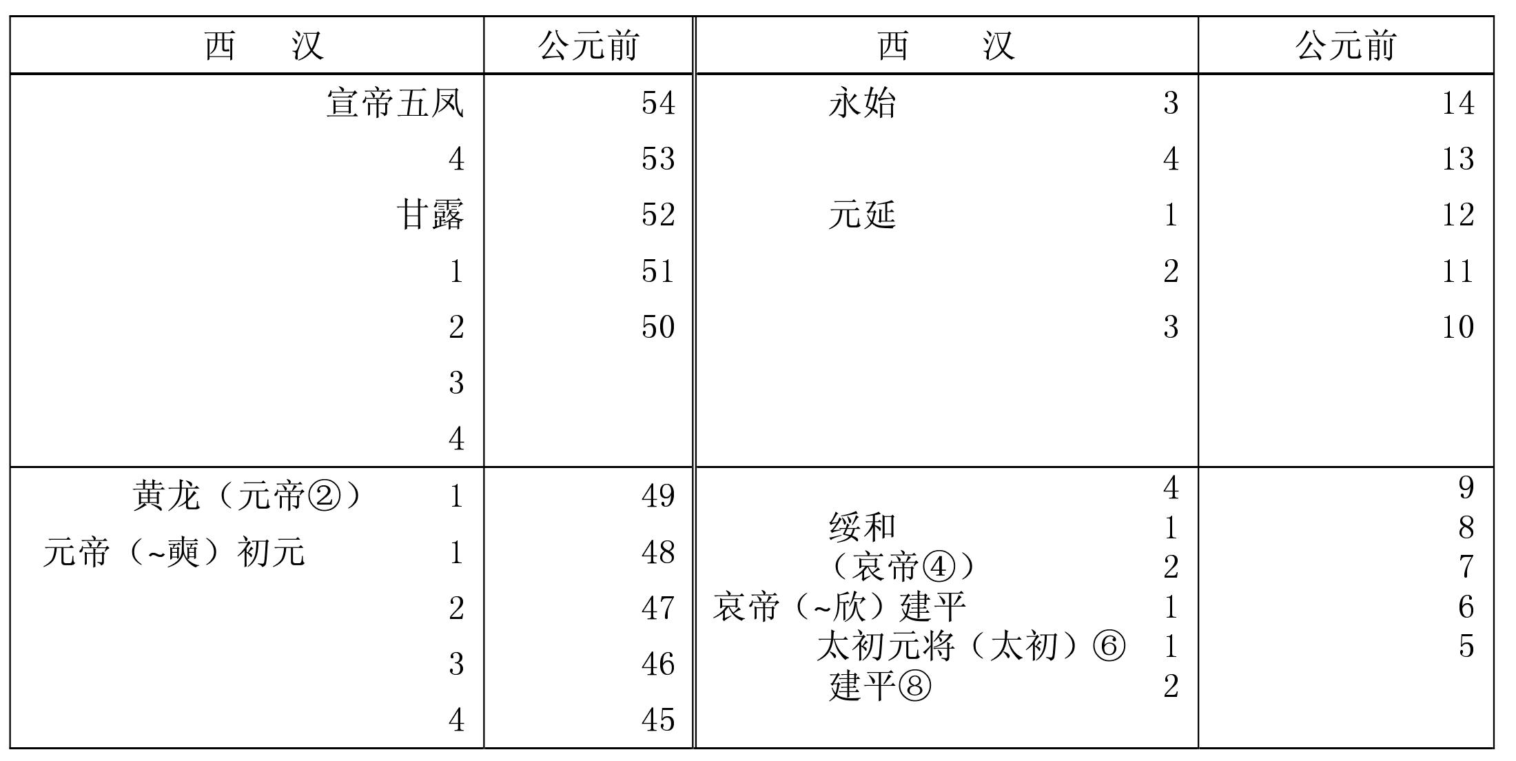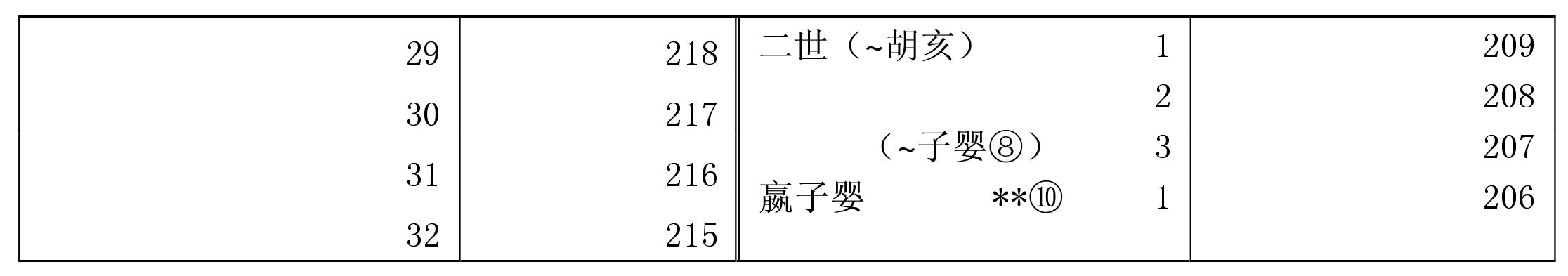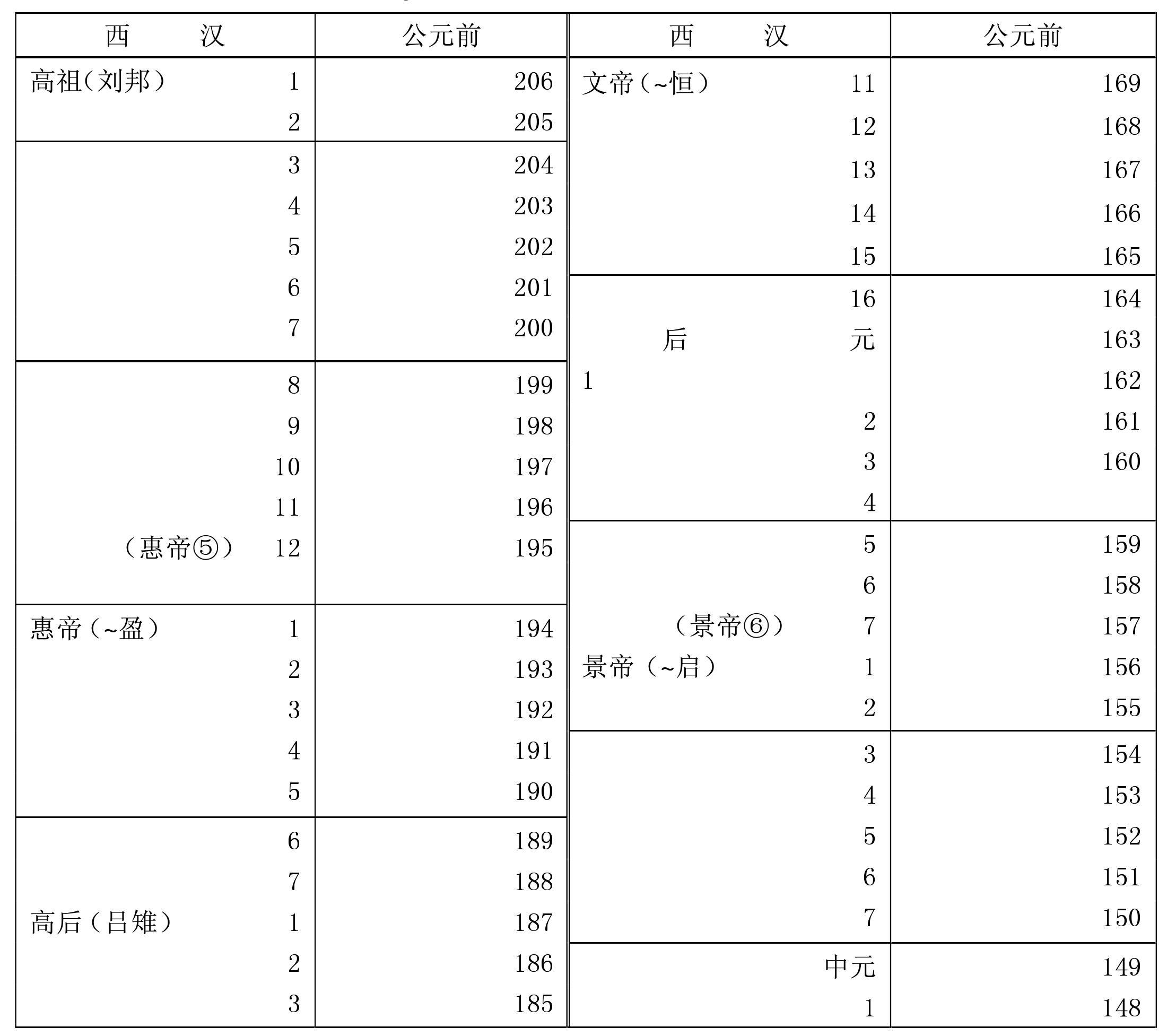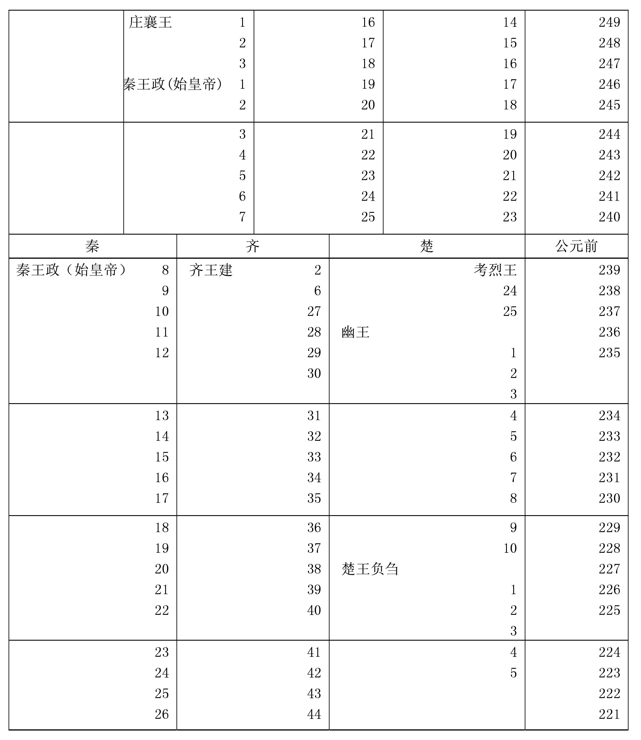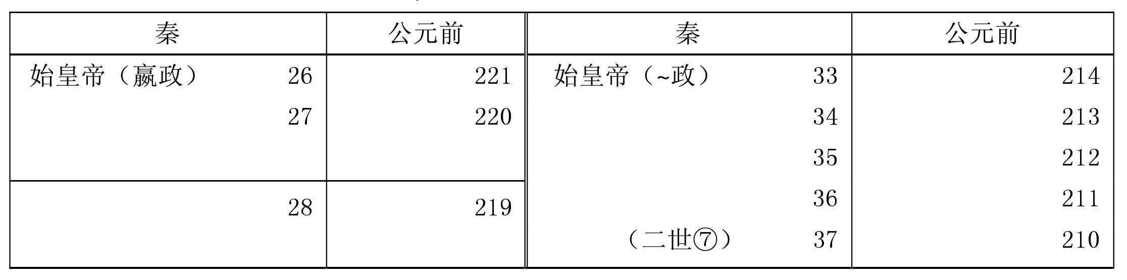 *秦王政公元前221年统一全国,称始皇帝。 **子婴八月即位,十月即降于刘邦,秦以十月为岁首,故列在前206年栏内。汉(前206—前220) 8西汉(前206—公元25)*