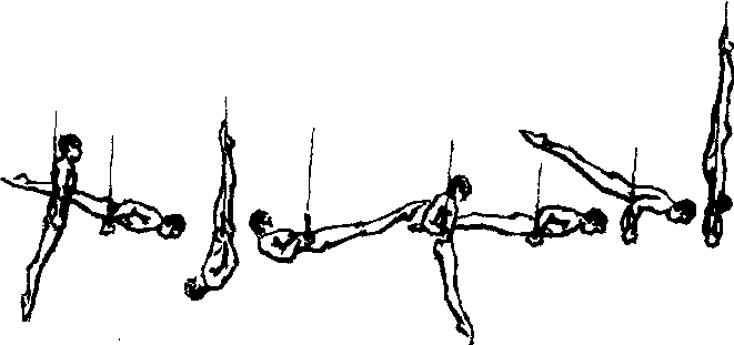 是一个力量性很强的中难度以上的动作,是由前回环和慢起倒立动作连接而成,一般是用屈臂来完成。常见的有屈体前回环成手倒立,直体前回环成手倒立,也有直体前回环直臂直体慢起手倒立。上述3个动作在1993年规则中分别定为B组、C组和D组难度。整个动作除了保持慢速、均匀、连贯外,关键是要注意用力保持前回环有较高的重心,以及两臂在紧张用力时的翻转技术,在前回环的前半部分是掌心向前支撑控制身体重心的高度,在前回环的后半部分则转为掌心向后用力压环使身体重心上升完成支撑,获得支撑后又要转臂稍外翻环,掌心稍向前,用力推环使身体上升成手倒立。用直臂直体完成手倒立时对肩臂和腰腹的力量要求很高。在教学训练中,只有能熟练地完成前回环、屈臂直体和直臂直体慢起手倒立动作之后,才能将两个动作连接起来完整地完成。可参见前回环、屈臂直体慢起手倒立和直臂直体慢起手倒立条目。