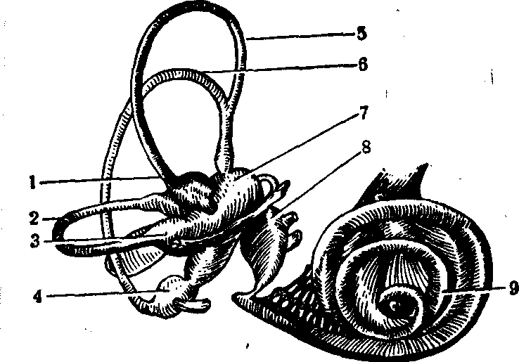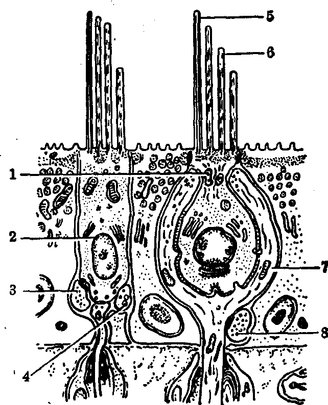 图2 两类毛细胞 1.Ⅰ型毛细胞 2. Ⅱ型毛细胞 3.输出神经终末4.输入神经终末 5. 动纤毛 6.静纤毛 7.神经杯 8.输出神经终末