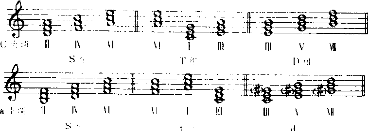 其中Ⅲ(⫼)和Ⅵ(Ⅵ)级和弦都隶属于主、属或主、下属两个功能,但Ⅳ级首先属于主功能(T)组,其次属于下属功能(S)组;而Ⅲ级首先属于属功能组,其次属于主功能组。而在小调中,⫼级在和声小调中升高五音即sol,形成增三和弦,而增三和弦由于极不稳定,也不协和,因此它不能作为主功能,所以在小调中的⫼级只有属功能性质而没有主功能性质。