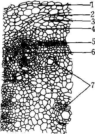 甘薯块根横切 1. 皮层 2. 内皮层 3. 中柱鞘 4. 韧皮部 5. 形成层 6. 原生木质部 7. 副形成层 |