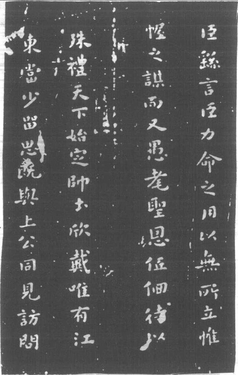力命表 (局部) 單刻帖。無款。傳三國魏鍾繇書。此係鍾繇 “五表”之一,較其余 “四表”字為小。細楷八行,筆鋒銛銳,清雅端莊,體勢峻拔,頗富古意。傳嘗刻入宋代匯帖中,惜均不傳。重刻可由 《偽星鳳樓帖》、《潑墨齋帖》 中見之。又 《快雪堂帖》刻有王羲之臨本,風流妍美,精彩异常,不逸古意。清王良常 (王澍)云: “此表模拓失真,終乏勝概。”不知其據何本品題之,若指 《快雪堂帖》刻本,則不當矣。 |