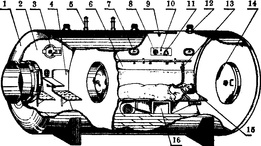 加压舱示意图 1.耐压壳体 2.副舱 3.传物舱 4.折椅 5.安全阀6.主舱 7.观察窗 8.送话器 9.火灾报警用传感器10.信号装置 11.舱内压力表 12.外照明 13.供氧装置 14.舱门 15.可折床 16.空调装置 加压舱的工作压一般为10~25kgf/cm2。供模拟深潜用的加压舱,其工作压可达50~170kgf/cm2。舱的直径通常为2~2.5m。 壳体内部分隔的两个单独舱室,大小不同。大的称主舱,是供使用的主要舱室; 小的称副舱,供人员出入荷压状况下的主舱时用,故又称过渡舱。主舱内设有可折的床和折叠椅; 舱壁上装有供舱内外通讯用的电话机或对讲机的送话、受话器,以及应急信号装置(通讯装置失灵时使用)。舱内装有供氧装置(见“供氧装置”) 及排氧装置(见“排氧装置”)。舱壁装有压力表,用以指示舱内压。舱壁两侧有若干观察窗,供直视观察用。舱内照明,用特制的耐压灯具; 也可采用舱外照明; 将灯光通过照明窗照入舱内。舱外照明的优点是安全和不须耐压。副舱内设有折叠椅和简易工作台,其它设施与主舱基本相同。 主舱和副舱之间的门关闭时,两舱隔开; 开启时两舱连通为一个舱。在双舱三门式,此门只有一扇,只能朝主舱内开,因此,副舱内压必须不大于主舱内压,副舱不能单独加压。在双舱四门式,隔板两侧都有门扇,分别向主、副舱开,故副舱可单独加压使用。 主舱和副舱壁上都设有可经调压而与舱外互相传递小件物品的传物舱,用于在荷压时递入药品、医疗器械、食物、饮料等或递出污(废)物、排泄物等。 在主舱和副舱的顶部都装有安全阀,当因误操作或进气阀泄漏引起舱内压增高并超过舱的工作压时,安全阀即自动开启而排气并发出响声。主、副舱之间的隔板(或门扇)上,装有压力平衡阀。在副舱调压而舱间门未打开之前,往往需开启平衡阀,使主、副舱内压完全平衡。舱内进气管的末端,连接消音器,用以降低加压时舱内的噪声。 加压舱的操作控制台,设于加压舱外的一侧,舱内各种工作状况(简称“工况”)的操纵机构 (如各种按钮或手柄)、显示装置(如舱压表、温度指示调节仪、湿度计、氧浓度监测仪、CO2浓度监测仪等)、通讯设备以及各种信号等均集中安装于操作控制台。由一名专职操作者(“操舱员”)操作。 需舱内外相通的导电线路,均经穿过舱壁的接线柱中继。每一接线柱都由中间为导体、周围填充绝缘密封材料所组成。主、副舱可各配若干对接线柱。 根据加压舱的实际需要,可将各种工况和参数通过相应的仪器记录。对加压舱供气和从加压舱排气,都可借手动阀门操作,也可用气动薄膜调节阀或电动调节阀进行遥控操作;还可实行自动控制。 加压舱的空调系统能使舱内温度和湿度控制在给定范围。为防止舱内因产生火花而引起火灾,加压舱配有火灾报警器和自动灭火装置。 加压舱的管道主要有进气管、排气管、供氧管、压力检测管等。不同用途的管道,分别涂不同颜色作标记。大部分管道都用无缝紫铜管,排气管等则用无缝钢管。管道的排列须便于维修,并整齐美观。 使用加压舱时,须按规定的程序、方法和要求进行操作。一般可分为三个阶段: 第一,加压前的检查和准备。着重检查气源、电源、各附属设备和仪器、仪表是否正常,各控制机构和阀门是否处于正确位置(开或关),对舱内需用的各种装置和物品作好使用前的准备和检查。第二,从开始加压至减压完毕这一阶段的操作和观察。操舱员应和舱内人员密切联系,要注意舱压,舱内氧浓度(特别是饱和潜水和吸氧时)和CO2浓度的变化,掌握各附属设备和装置的性能,及时排除异常现象。第三,舱内人员减压出舱后,应按要求做好加压舱的维护保养,及时排除在使用过程中发现的故障,使加压舱具备良好的使用性能。 供气控制台 供气控制台是充气和供气的控制中心,由管、阀、示压仪表和信号装置、压力报警器等组成。其用途为导引空气压缩机输出的压缩空气充入各组储气瓶,以及储气瓶中的压缩空气供给加压舱或潜水站使用。由于这两方面用途的要求,供气控制台装有各储气瓶组的进气控制阀和排气控制阀; 还装有通向各加压舱和潜水站的供气控制阀。显示各组储气瓶内压和空气压缩机向储气瓶充气压力的压力表,也设在供气控制台上。供气控制台操作者与操舱员、空气压缩机的操作人员,藉信号(或电话)联系,协同操作。 储气瓶 储气瓶是用以储存压缩空气和其它混合气的钢制耐压容器,根据工作压的不同,可分为高压、中压和低压等几类。向加压舱供压缩空气用的储气瓶,多采取高压或中压气瓶。储气瓶以立式安装为多,并分成若干组,所储气量应能满足加压系统的使用需要。 充入气瓶的压缩空气,一般应隔若干小时后再供使用,这样有利于压缩空气的净化。当加压舱需要用气时,由供气控制台打开储气瓶的排气控制阀,储气瓶中的压缩空气即供给使用。高压储气瓶中的压缩空气,须经适当减压后才进入加压舱,以保证使用时安全可靠,并减小舱内进气噪声。 为了防止气瓶内压随外界气温的升高而增加并为保护气瓶,室外的储气瓶,都应采取遮阳挡雨和保护措施。空气净化过滤装置 空气净化过滤装置 (简称净化装置)是用以除去压缩空气中的油、水和杂质,使压缩空气符合潜水呼吸气体的纯度标准(见“潜水呼吸气的纯度标准”)的设备。净化装置由除湿器、吸附器和过滤器组成,除湿器和吸附器均布置成可交替使用