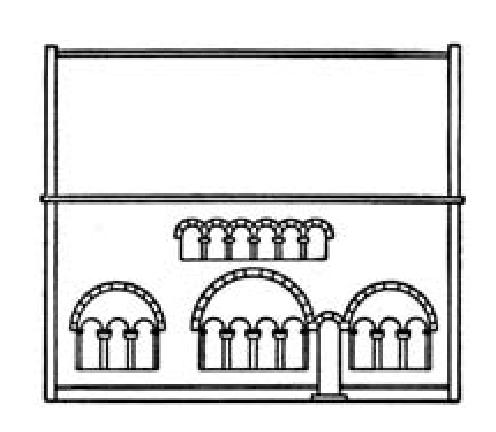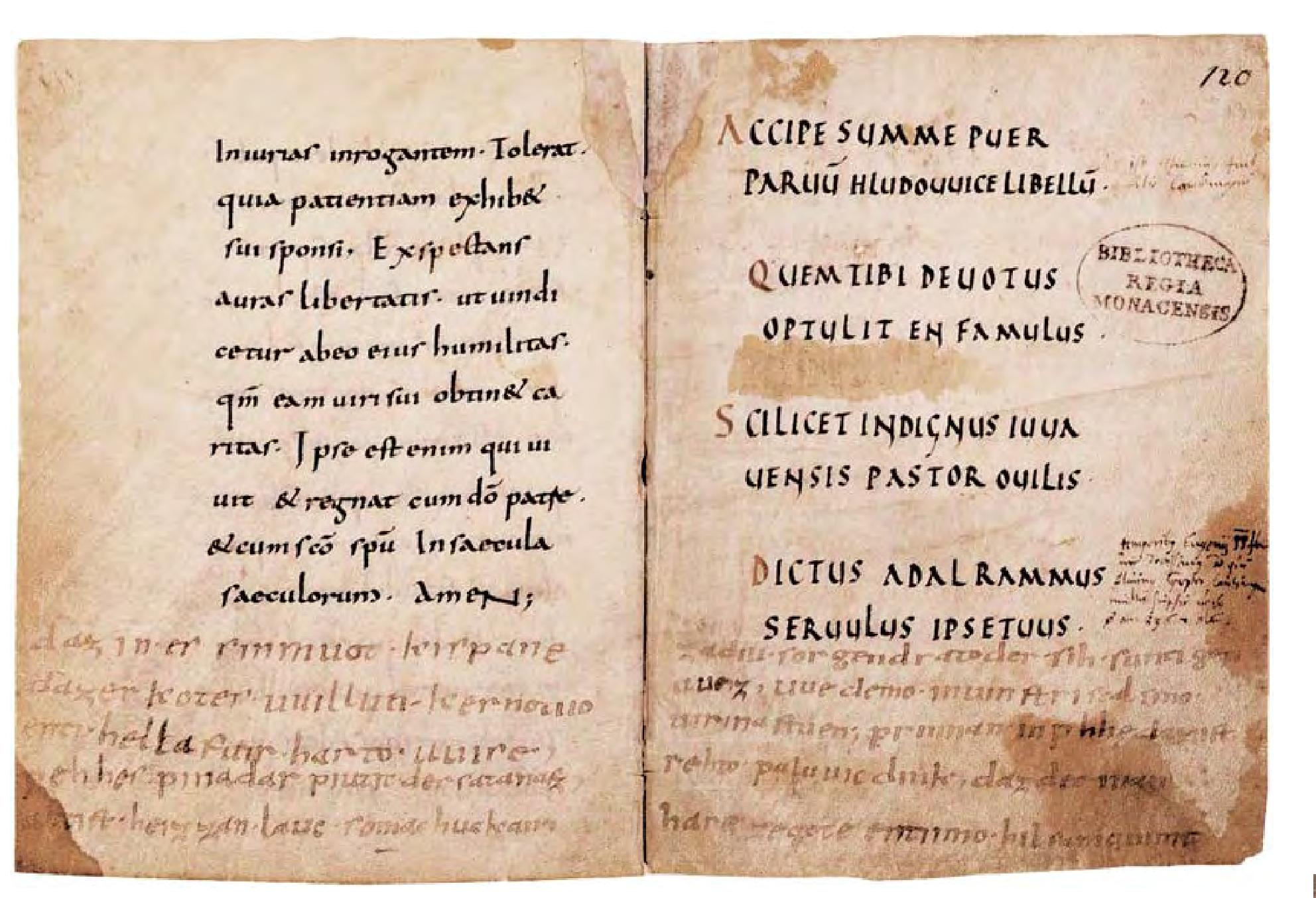 加洛林时期的建筑 在加洛林小写体中还采用了字体应用的等级制度,它配合书本的序页同时设计。文字的最高等级体现在首字母。在使用小写字体书写“规范”文本段落前,一页的最开始使用方书体,接下来的一级是安色尔体,最后才是半安色尔体。而许多“不麻烦”的手写稿仅仅只分为两层等级:方书体和小写体。 东法兰克王国国王路德维希二世属地的手写文稿(约公元830年),左面是加洛林小写体,右面是方书体,下面是公元9世纪末德国加洛林小写体书写的补充文字。 |