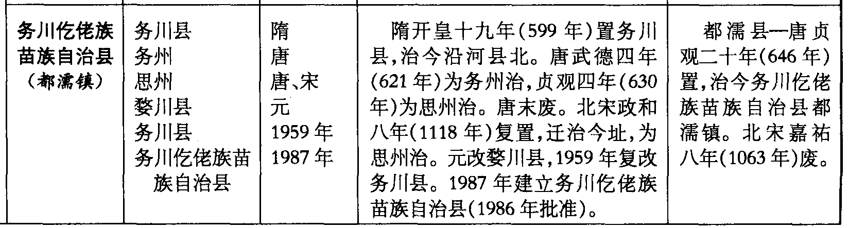 务川仡佬族苗族自治县(都濡镇)务川县务州思州婺川县务川县务川仡佬族苗族自治县隋唐唐、宋元1959年1987年隋开皇十九年(599年)置务川县,治今沿河县北。唐武德四年(621年)为务州治,贞观四年(630年)为思州治。唐末废。北宋政和八年(1118年)复置,迁治今址,为思州治。元改婺川县,1959年复改务川县。1987年建立务川仡佬族苗族自治县(1986年批准)。都濡县—唐贞观二十年(646年)置,治今务川仡佬族苗族自治县都濡镇。北宋嘉祐八年(1063年)废。
