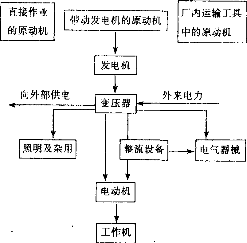 上图表明,企业原动机的能力一部分直接用于工作机和厂内运输工具,一部分用于带动发电机。发电机把机械动力转化成为电力,然后分配给电动机和电气器械,或向外部输送。电动机又将电力转化成为机械动力以带动工作机。同时,企业的电动机和电气器械也可能使用外来电力。各种动力机械之间存在着转换动力的关系。因此计算企业动力机械总能力时,不能把所有的动力机械能力直接加总,否则就会重复计算或遗漏。应按下面的公式计算: