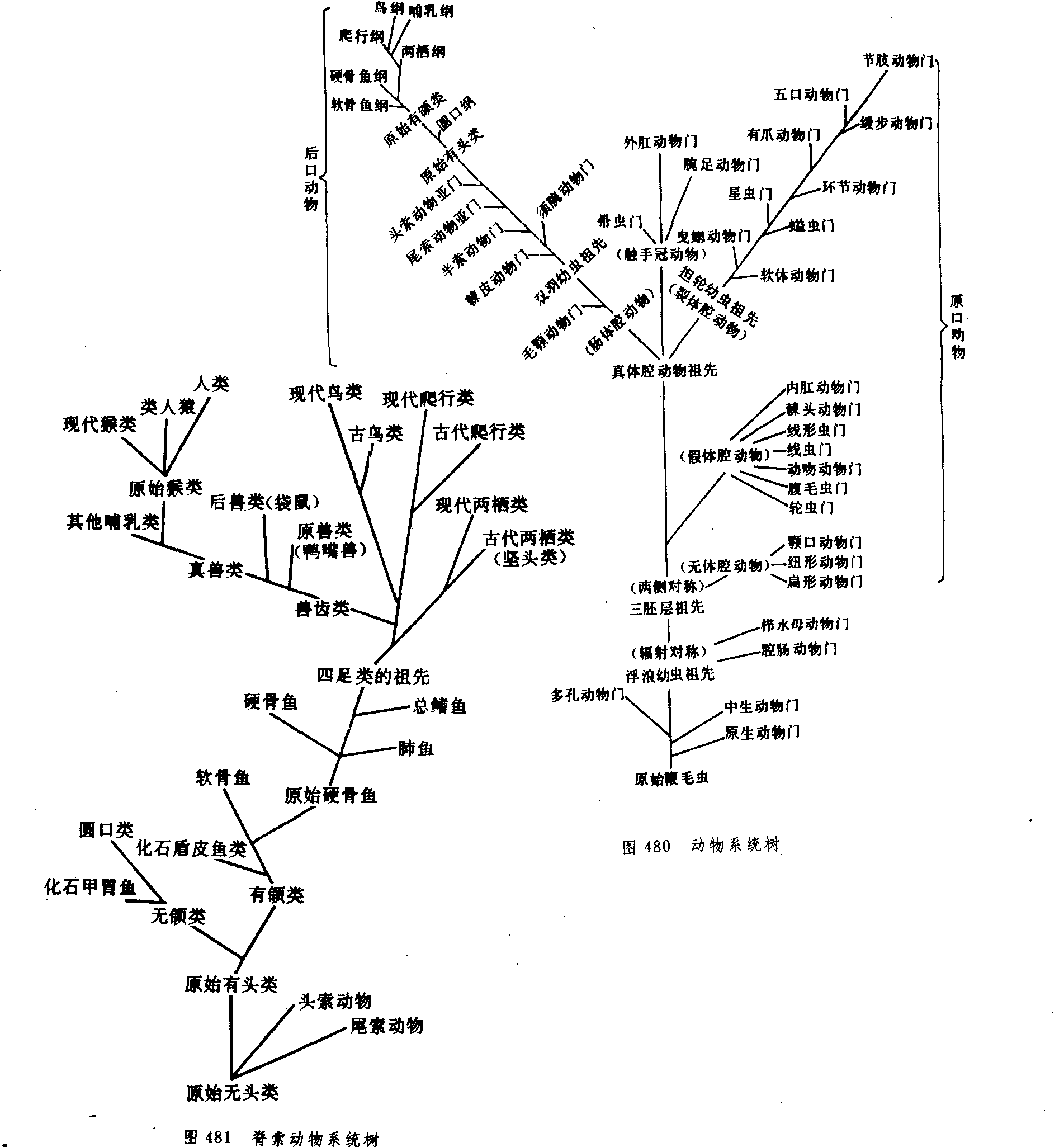 凡原肠胚期的原口成为成体的肛门,而与原口相对的一端,重新开口成为成体的口的动物,统称为后口动物。它们以肠腔法形成中胚层,具有由中胚层形成的内骨骼;神经系统呈索状或管状;具有真体腔。后口动物包括毛颚动物门、棘皮动物门、须腕动物门、半索动物门和脊索动物门。毛颚动物门(Chaetognatha)的体壁结构、消化道和无体腔膜等特征都与原口动物相似,是后口动物中的1个特殊分枝。其余后口动物是由与现存的棘皮动物幼虫相似的羽腕幼虫祖先发展而来的。棘皮动物门(Echinodermata)的多数代表动物是辐射对称的(次生现象,幼体是两侧对称),这与过渡到固着或很少活动有关,在进一步的进化发展中,有些动物又重新形成了两侧对称。须腕动物门(Pogonophora)过去曾一直被认为是无脊椎动物中最高等的后口动物,但自1970年发现有分节并具有刚毛的尾节种类后,有人认为它们与环节动物门的多毛纲有关。因此,须腕动物门的进化位置尚有争议。由于半索动物(如柱头虫)仅有雏形的脊索(口索),虽有1条不完善的背神经管和鳃裂,但尚有腹神经管,其幼虫又与棘皮动物海星的幼虫极为相似。因此,目前未将它放在脊索动物,处于无脊椎动物和脊索动物之间的位置。从无脊椎动物的进化历程中可以看到,它们的结构和功能的变化,由简单的单细胞到复杂的多细胞;由两胚层到三胚层;由辐射对称到两侧对称;身体由不分节到有体节;由无附肢到有附肢,再到分节附肢;体腔由无体腔到假体腔,再到真体腔等,这一切演变都有利于动物能更好地适应各种不同的水陆生活条件,各类动物之间都有着或近或远的亲缘关系。虽然原口动物在演化中占有重要地位,但后口动物是整个无脊椎动物的主干,由它进化到更高级的脊索动物。