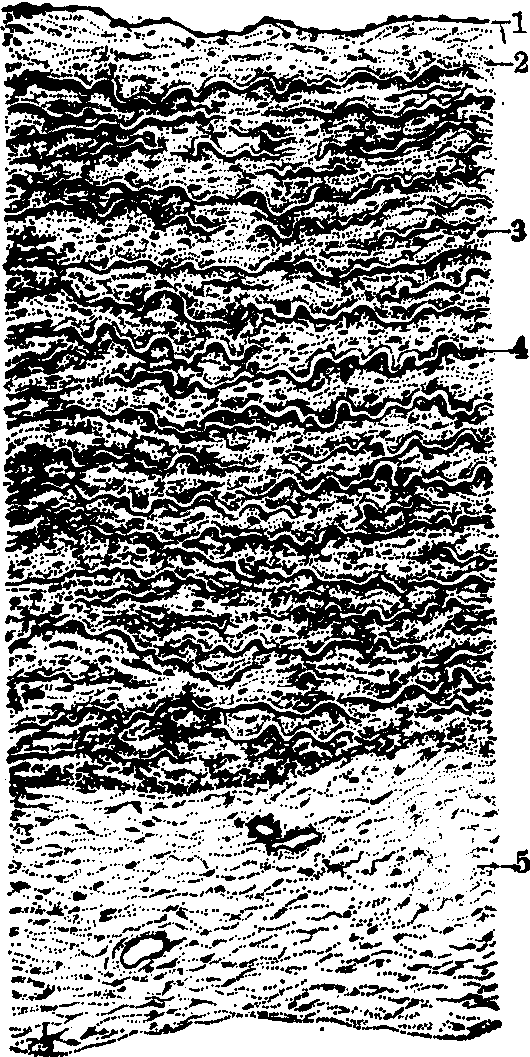 图2 中动脉的结构(低倍光镜) 1.内皮 2.内皮下层 3.内弹性膜 4.中膜5.平滑肌 6.外弹性膜 7.营养血管 8.外膜