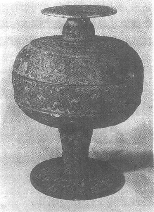| 释义 | 勾连云纹铜豆 勾连云纹铜豆战国。盛食器。通高24厘米,口径17.5厘米。1965年湖南省湘乡县新㘭3号墓出土。湖南省博物馆藏。此豆有盖,高圈足。盖顶和圈足均为两次浇铸而成。盖顶饰几何云纹,盖面及器壁均饰勾连云纹。通体原来嵌有铜丝及绿松石,现均已脱落。