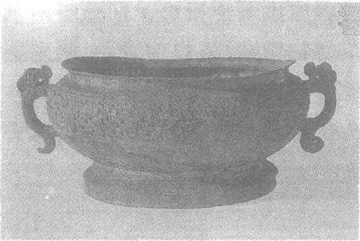 西周。古代盛食器,礼器。高11.2厘米,口径20.8厘米。1976年江苏省丹阳司徒出土。镇江博物馆藏。此簋卷唇,膨腹,低圈足。器两侧各有一夔龙形兽耳。腹部以密点为地,饰以勾连纹。足上部饰细狭的雷纹带。此簋体特别矮,勾连纹为主花纹,好似中原地区的一种夔纹,但无首爪可寻,也比较特殊。
