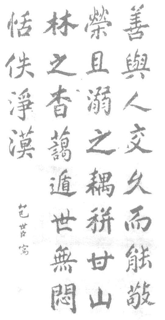 清。纸本。纵137.5厘米,横63.5厘米。北京故宫博物院藏。包世臣(清乾隆四十年—咸丰五年,即公元1775—1855年),字慎伯,号倦翁、小倦游阁外史,安徽泾县人。嘉庆间举人,官新喻知县。善属文,工书法。在书论和碑帖考订上有独到建树。提倡扬碑抑帖,继承善與人交久而能榮且溺之耦𥞩甘山林之杳藹遁世無悶恬佚淨漠包世臣寫阮元两论(《南北书派论》、《北碑南帖论》),对清中期以后书法界刮起的北碑风,起到了推波助澜的作用。著有《安吴四种》,及著名的《艺舟双楫》。此幅作品,楷书录语:“善与人交久而能敬荣且溺之耦𥞩甘山林之杳蔼遁世无闷恬佚浄漠。”《安吴四种·叙录》载:“慎伯中年书从颜欧入手,转及苏董,后肆力北碑,晚习二王,遂成绝业。”从这幅书法中,可见到颜字浑厚阔展,也有北碑方整刻露的特点,而更多的是一种博大有力的气势。