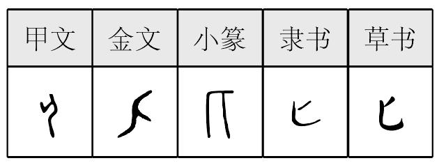 匕(bǐ)“ ,相与比叙也。从反人。匕亦所以用比取饭,一名柶。凡匕之属皆从匕。”(卑履切) 王筠《说文释例》:“匕字盖两形各义,许君误合之也。比叙之匕从反人,其篆当作 ……;一名柶之匕,盖本作 ,象柶形,与勺篆作 相似,其物本相似也。勺之柄在下, 之柄在上耳。……由此观之,其为两义,较然明白。……流传既久,字形同也。”许慎对“匕”的字义有两种解释,一是说人与人相与比之义,所以从反人,这是说“匕”和“比”上古为一字;二是说匕是取饭用具,就是今天所谓的羹匙或小勺。如《三国志·蜀书·先主传》:“先主方食,失匕箸。” 甲骨文或作 、 、 ,象人鞠躬或匍匐的侧形。卜辞中用为妣,先祖之配偶。[1]金文中或用为器名,或借为“妣”。关于反人,杨树达《释匕》认为许慎“相与比叙”解释不清楚,提出“匕”即“妣”之初文。他根据妣之籀文作 、牡牝相对、麀从匕而非从牝省等理由,证明“匕”即与“男”相对之“女”。“然则字何以从反人也?曰:凡圆胪方趾之类皆人也,然人之中有男女之别焉。造文者艰于创构,小变人之形以表人类中之女,固事理之宜也。”[2] 匕部有八个属字。如“匙”字下云:“匕也。从匕,是声。”“顷”字下云:“头不正也。从匕,从页。”又如“卬”字下云:“望,欲有所庶及也。从匕,从卪。《诗》曰:‘高山卬止。’”又如“卓”字下云:“高也。早匕为卓,匕卪为卬,皆同义。” 匕*bǐ(2画)