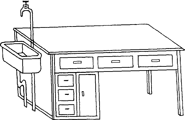 图2 教师演示桌 板,可放学生的书籍文具。❷ 学生坐凳 凳高440mm,可做成圆形或方形。学生上分组实验课时,每个学生都应坐着进行实验,以防学生来回走动影响课堂秩序。 ❸教师演示桌 供教师做演示实验和摆放仪器、模型等直观教具的专用桌。桌面应宽大,图2是一种普通的教师用演示桌。桌下也可安有横隔板,用以放置备用或用完的实验器材和教具等。演示桌面要能耐磨和耐酸碱腐蚀。 ❹ 仪器柜 存放化学实验仪器的专用柜,一般放置在仪器室和实验准备室内。图3所示的仪器柜,分上下两层,每层内放