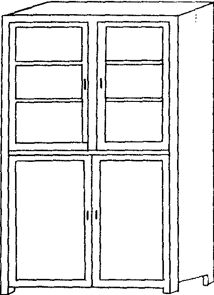 ❺药品柜图4所示的药品柜是存放一般原包装试剂的木质药品柜,柜内搁板为台阶式。这种结构的药品柜便于取用药品,又能充分利用空间。柜的下层为木板门,可存放避光药品和大包装药品。毒品应