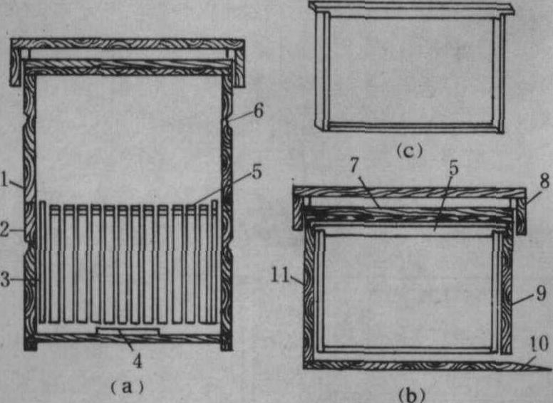 十二框方形蜂箱 巢箱四周板厚25~45毫米,内围尺寸长455毫米,宽455毫米,高330毫米(或450×450×330毫米),呈正方形,箱内容纳12个巢框与两块隔板。框槽宽11毫米,高20毫米。一般不采用铁引条,巢框的框耳直接放在框槽之上。前壁距上沿70毫米处,中央开一直径为25毫米的圆孔,作为上部巢门,用圆木塞启闭。继箱高度为310毫米。巢框外围长435毫米(不计框耳),高300毫米。内围长415毫米,高270毫米。巢框的巢脾单面有效面积为112050平方毫米。在巢箱中,巢框之间的中心距为37.5毫米。 蜂箱壁厚,有的前后壁还制作成双层的箱壁;在箱体上下的连接处,为裁口缝的结构,吻合紧密;在箱盖之下有保温框;因而十二框方形蜂箱具有较好的保温、御寒性能。巢箱容积大,巢框大而多,有充裕的地方供蜜蜂贮蜜,有足够的育儿面积供蜂王产卵,适于寒冷地区强群越冬、春季蜂群增殖和推迟上继箱的要求。若箱底与巢箱制成活动箱底,由于箱体呈正方形,天气暖和的季节,可使巢脾与巢门垂直,成冷式蜂巢,利于空气流通,蜜蜂出入方便;天气寒冷的季节,将巢箱转动90°,使巢脾与巢门平行,成暖式蜂巢,利于保温越冬。这是方形蜂箱的独特优点。但箱体笨重,搬运困难,而且非强群则难以叠加继箱,不能区分育虫区和贮蜜区,影响蜂蜜的质量。 十二框方形蜂箱12-framessquarehive一种改良式的达旦蜂箱。用于饲养西方蜜蜂。这种蜂箱的巢脾中心距为37.5 mm;框间蜂路为12.5 mm、上蜂路和前后蜂路均为10mm,继箱无下蜂路,底箱的下蜂路为20 mm;巢框内围尺寸为415 mm×270 mm(宽×高),每个箱体容纳12个巢框。十二框方形蜂箱箱体容积大,春季可推迟上继箱,冬季可多贮蜜,省却饲料箱越冬;其框间蜂路大,夏季便于流通空气降温,冬季便于蜜蜂结团保温。蜂箱体壁较厚,且上下箱体叠合处以裁口叠合,有利保温;箱体的内围长与宽相等,四壁上口内沿均有框槽,冬季可把巢脾横向排列,形成暖式蜂巢,适于气候寒冷地区采用。中国的东北和新疆北部的养蜂者多采用这种蜂箱。 |