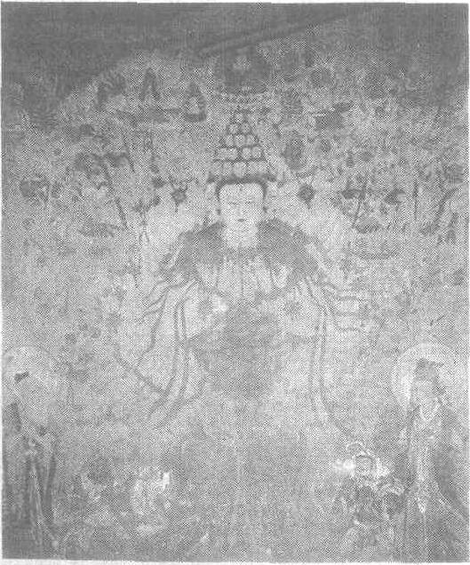 | 释义 | 千手千眼观音壁画 千手千眼观音壁画金。纵573厘米,横491厘米。山西省朔县崇福寺弥陀殿南壁壁画。千手千眼观音是观世音的化身,其形象常见于佛教壁画和塑像。此像为18面。正面的主要一面脸形丰圆,五官小巧,神态庄重,具有时代风格。观音的18面之上顶一莲花座,座上的小佛结跏趺坐,施弥陀印,身上的红色袈裟鲜艳夺目。观音的千手掌心皆有一眼,手持不同的法器,手姿多态,无一雷同。腹前的四手共捧一钵,钵内矫龙翻腾。整个画面描绘精致,人物线条纤细,设色艳而不俗,气势可观。