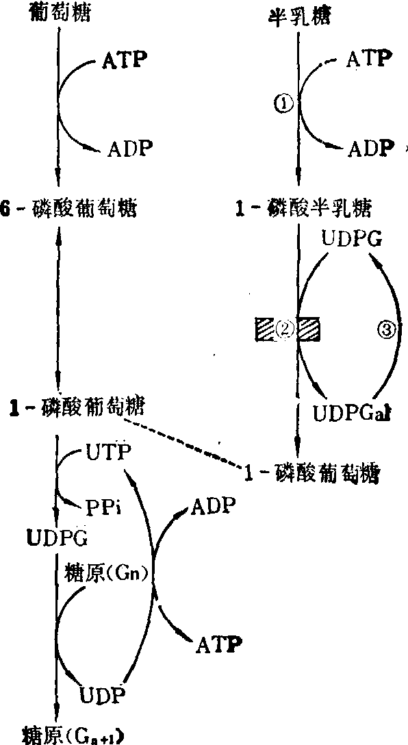 图示半乳糖血症发病机理,由于1-磷酸半乳糖尿苷酸移换酶缺乏,1-磷酸半乳糖不能转化为1-磷酸葡萄糖,从而进入葡萄糖代谢 ❶半乳糖激酶 ❷1-磷酸半乳糖尿苷酸移换酶 ❸UDP半乳糖表构酶 ADP二磷酸腺苷 ATP三磷酸腺苷 UDP二磷酸鸟苷 UTP三磷酸鸟苷 UDPG尿苷二磷酸葡萄糖 UDPGal尿苷二磷酸半乳糖 PPi焦磷酸