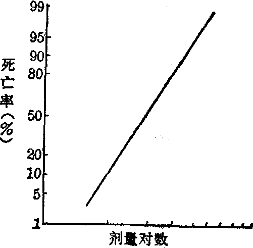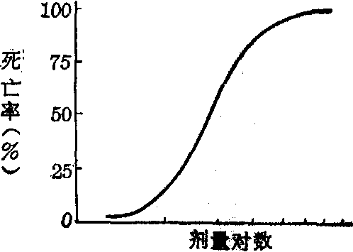图2 剂量对数与动物死亡数的关系 如按不同剂量分组,观察实验动物的死亡率,可见死亡率随剂量增加而递升,绘出的曲线称为剂量反应曲线,呈长尾S形(图3)。如将剂量作对数变换后,则剂量反应曲线呈对称的S形(图4)。此曲线两端伸延较缓,说明低剂量与高剂量的改变引起动物反应率变化很小。而曲线中段,斜度较大,特别在死亡率50%处剂量稍有改变,即引起反应率明显变化,说明LD50甚为敏感。如将反应率作概率单位变换,即以概率单位尺度表示,将对称的S形曲线直线化,则更便于统计处理(图5)。图6表示同样实验物质在相同实验条件下进行四次实验的一簇剂量反应线。在死亡率为50%处,其致死量非常一致,但在较低死亡率与较高死亡率的致死量,则四条反应线差别明显,说明LD50甚为稳定。由于LD50不但灵敏而且稳定,故常用作反映实验物质毒性大小的指标。 实验设计要求 (1)染毒剂量的确定。参考有关资料或作预备试验,找出动物全部不死亡和全部死亡的剂量范围,并加以分