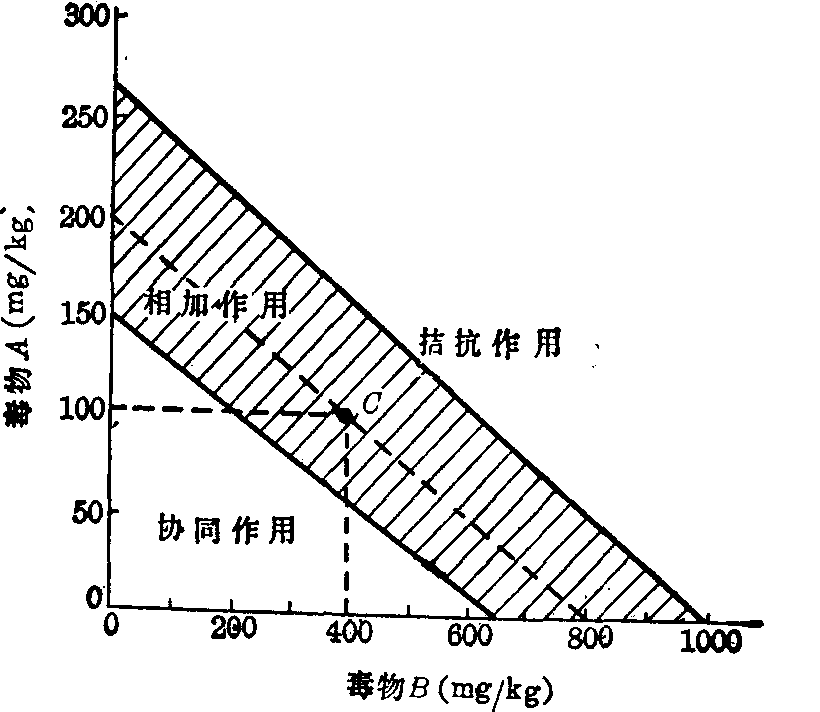 等效应图解法是先分别测出A、B两种毒物的LD50及其95%可信区间的上、下限,并分别标在Y轴与X轴上。再分别将A、B毒物的上限、LD50及下限的相应坐标点联成三条直线,构成等效应区(如图7);将A与B毒物按各自的LD50水平之比混合后,测定混合毒物的LD50;再将此LD50按原混合比例分成两部分,分别以A与B毒物的剂量表示。按此剂量点在图中的位置,判断A与B毒物联合作用的特征:如剂量点在等效应区之内,则表示A与B为相加作用,在该区下方表示协同作用,在该区上方表示拮抗作用。 例 A毒物的LD50为200mg/kg,其95%可信区间为150~267mg/kg;B毒物的LD50为800mg/kg,其95%可信区间为650~985mg/kg; A与B LD50之比为1:4,又测得按此比例的混合毒物的LD50为500mg/kg。试分析A、B的联合作用。 依题意绘出图7等效应区。将混合物的LD50 500按1:4分开,得A为100,B为400。分别过100及400处作直线平行于X轴及Y轴,两直线相交于C。今C点落在等效应区内,故A与B两毒物的联合作用为相加作用。