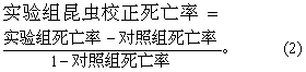 (2) 实验动物的选择与分组。根据实验的性质合理选择动物的种属。在同一实验中,动物的性别、年龄、体重应尽可能一致。若雌雄混合编组时,每组雌雄各半。动物分组应严格遵守随机化的原则。以昆虫作实验时,因考虑昆虫易产生自然死亡,如对照组死亡率在10%以下,可按式(2)对实验组死亡率进行校正后再计算LD50。