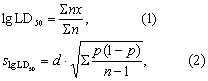 (lgLD50-1.96slgLD50,lgLD50+1.96slgLD50)。(3)例 用某农药对小白鼠进行序贯急性毒性实验,设计及实验结果见表1。两相邻剂量对数的差值d=0.1662,给药从剂量315.2mg/kg开始,实验到四只鼠后,反应符号改变,故从其前一鼠作第1号动物,共用鼠20只。求其半数致死量。 表1 序贯法动物存(0)亡(×)记录
