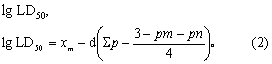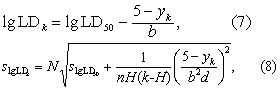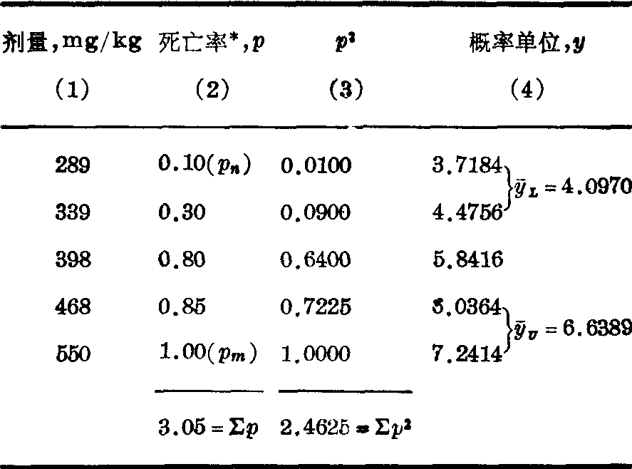 U为剂量较高的H组中各概率单位的均数, L为剂量较低的H组中各概率单位的均数。(3) 求LDk。按式(7)可求任何死亡率k%时的致死剂量对数lgLDk,按式(8)求其标准误slgLDk。