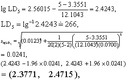 (3)求LD5及其95%可信区间。查“百分数p与概率单位对照表”得p=5%时,y5=3.3551。按式(7)~(9):