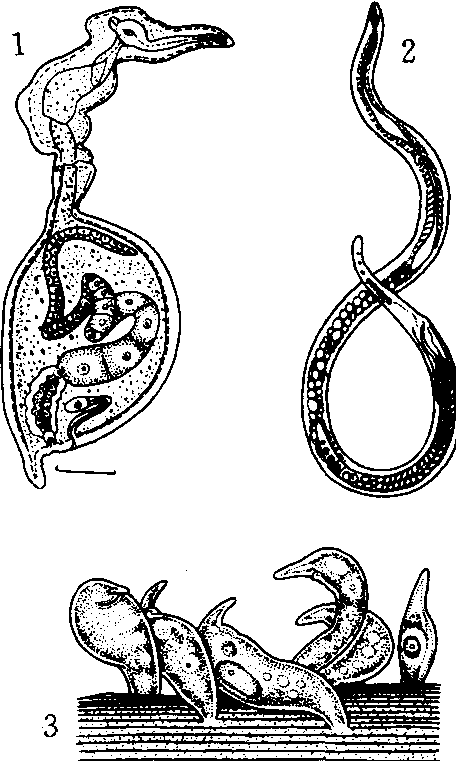 半穿刺线虫属有2个种,其中以半穿刺线虫 (T.semipenetransCobb)最重要,为害柑橘、葡萄、柿、橄榄等,该种广泛分布于世界各柑橘产区和埃及、印度葡萄园。中国柑橘产区普遍发生,如湖南、四川为害严重。此外,在葡萄、荔枝、龙眼和杉木上发生。 该线虫的一龄幼虫在卵内发育,孵化破壳已是二龄幼虫。当环境条件合适时,雌幼虫找到适当的营养根,以其前端侵染寄生,固定在根的外皮取食,后部裸露在根外活动,继续发育,并逐渐膨大,呈不规则囊状的成熟雌虫,更深地穿入皮层的薄壁组织保卫细胞取食。雄虫不取食,在土壤中活动。在适宜的寄主体内26℃下完成生活史需9周。 受害植株地上部生长衰弱,引起缓慢性衰退(slow decline disease),柑橘受害最为明显,受害根变褐腐烂,比正常根少而短;分枝减少,叶片和果实少而小,并提早脱落。该线虫还可和镰刀菌(Fusariumspp.)、疫霉(Phytophthora spp.)相互作用,引起复合症状。 培育无病苗木和用杀线剂克线磷(Nemacur)液浸泡柑橘病苗根系;或用48℃15分钟热水浸根后再种植。增施肥料,加强树势。大田施用克线磷、益舒宝(Macop)杀线剂进行防治,于发新根前施用有较好防效。 半穿刺线虫属Tylenchulus垫刃目。虫体长不足0.4 mm。成熟雌虫有细长的头颈、不规则膨大的食道后体部和渐细的阴门后端。雄虫、幼虫和未成熟雌虫线状;唇区不缢缩,排泄孔在虫体中后部。2龄幼虫和雌虫口针长11~15μm,基部球圆,清晰。食道前体部发育良好,不与中食道球合并,峡部细长,后食道球与肠紧贴。肛门模糊。雌虫单生殖管卷曲或先端回折1~2次;阴门近后端;缺后阴子宫囊。雄虫口针和食道退化。交合刺纤细,弓状;引带固定,缺交合伞。尾长锥状,与2龄幼虫相似。卵产于体表的胶黏物中。雄虫不取食。雌幼虫和年轻雌虫迁移侵染根表皮和皮层薄壁细胞。年轻雌虫头颈进入根内,体后部保留于根表并逐渐膨大,成为固定性半内寄生。本属有柑橘半穿刺线虫(T.semipenetrans Cobb)和分叉半穿刺线虫(T.furcusVan den Berg et Spaull)两种。前者危害柑橘、葡萄和其他多种经济作物;后者在南非寄生于甘蔗和牧草等。 |