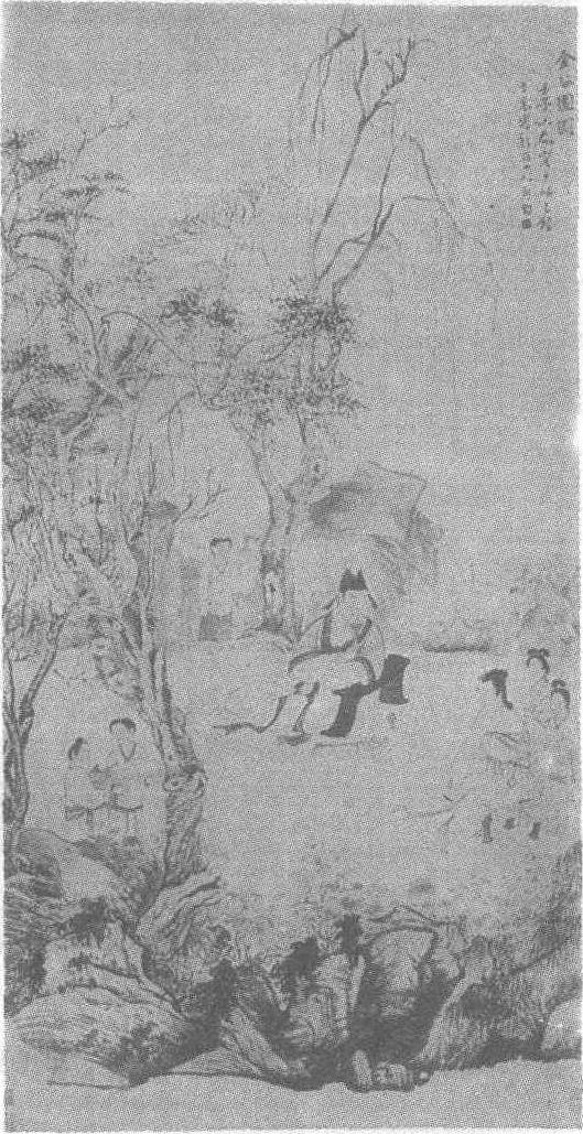清。华喦(见《华喦山鹊爱梅图轴》条目)绘。纸本设色。纵178.9厘米,横94.1厘米。上海博物馆藏。此图描绘的是西晋富豪石崇与爱妾绿珠的故事。石崇(公元249—300年)为荆州刺史时,建金谷别墅于河阳(今河南洛阳西北),室宇宏丽,侍妾皆曳纨绣、珥金翠,与贵戚王恺、羊琇等辈以奢靡相尚。崇有爱姬绿珠,美艳绝伦,善吹笛。权贵孙秀欲谋夺,绿珠坠楼自尽以身殉石崇,石崇及全家亦被害。园内有清凉台,为绿珠坠楼处。画面中心主人公石崇端坐于锦毯之上,面相丰满,体态魁伟,宽衣博带,气宇不凡。以左肘支几,右指轻拈须尖,神情专注,内心愉悦之情溢于言表。在石崇的注视下,绿珠坐在矮凳之上,口沾竹箫,头上步摇微摆,饰带轻飘,箫声随指悠然而出,仪态端庄可人。布局上以土坪为场景,突出主要人物,侍童数人散立各处,左右花木扶疏,并以湖石流水作点缀。人物描绘细腻,形神兼备。外部环境的质朴与男女主人公内在的气质与真挚丰富的情感,达到了和谐与统一,洋溢着诗一般的意境美。图作于壬子小春,作者时年51岁。