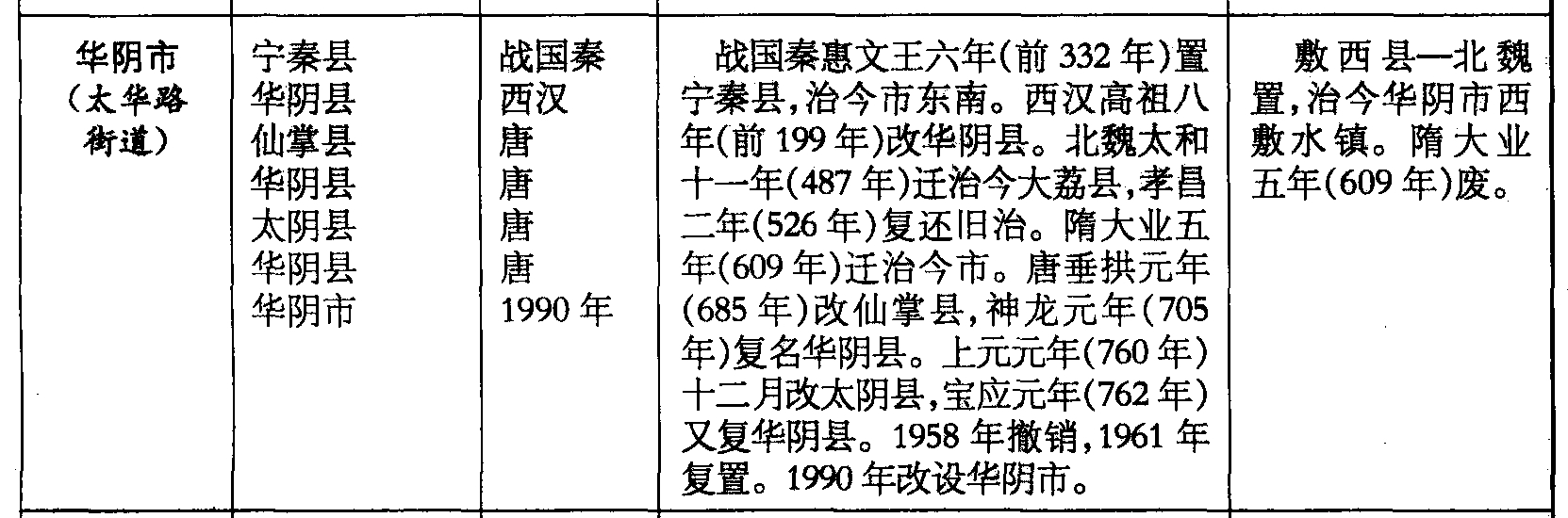 华阴市(太华路街道)宁秦县华阴县仙掌县华阴县太阴县华阴县华阴市战国秦西汉唐唐唐唐1990年战国秦惠文王六年(前332年)置宁秦县,治今市东南。西汉高祖八年(前199年)改华阴县。北魏太和十一年(487年)迁治今大荔县,孝昌二年(526年)复还旧治。隋大业五年(609年)迁治今市。唐垂拱元年(685年)改仙掌县,神龙元年(705年)复名华阴县。上元元年(760年)十二月改太阴县,宝应元年(762年)又复华阴县。1958年撤销,1961年复置。1990年改设华阴市。敷西县—北魏置,治今华阴市西敷水镇。隋大业五年(609年)废。