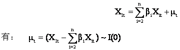 式中,b为正整数;β为协整向量;βi为协整系数。那么,随机向量Xt各元素之间存在协整关系,记为: {X1t,X2t,X3t,…,Xnt}~CI(d,b) 如果有d-b=0,那么有: {X1t,X2t,X3t,…,Xnt}~CI(d,d) 则对于回归方程: