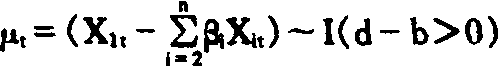 如果β唯一存在,表明非平稳随机向量Xt{X1t,X2t,X3t,…,Xnt}在时间上的实际变动与其长期均衡轨道一致,μt是收敛的,也就是说,即使在某一时点上{X1t,X2t,X3t,…,Xnt}的运动方向相互背离,但它们之间存在的长期规律或天然力量会使它们趋向一致。因而判定{X1t,X2t,X3t,…,Xnt}之间存在长期均衡关系。 如果有d-b>0,那么: