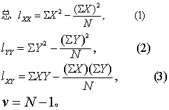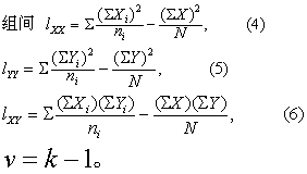 (3) 计算各处理组(或配伍组)间的离均差平方和、积和及自由度,按式(4)~(6)。