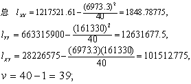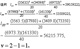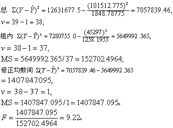 按式(7)、(8)求剩余平方和、自由度、均方(结果列入表2右侧部分)及F值,计算如下: