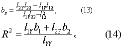 '3=118.74-0.4088(492.40-346.42)=59.06。多元协方差分析 若实验中需要将两个或两个以上的因素都化为相等,然后分析某变量修正均数的差别,而这些因素与某变量呈线性相关,那么可进行多元协方差分析。如欲将各组动物的食量与原始体重都化为相等,然后比较各组所增体重的修正均数间有无差别,则先用多元线性回归的方法,将食量、原始体重与所增体重的关系找出来,求出当食量、原始体重化为相等时,各饲料组所增体重的修正均数,然后用方差分析检验各修正均数间有无差别。现以二元回归为例说明其计算步骤如下: (1)计算各变量值的总和、平方和及积和,如表5。 (2) 计算总变异的离均差平方和及积和,按式 (1)~(3);计算组间离均差平方和及积和,按式(4)~(6);两相应部分相减,得组内离均差平方和及积和。如表6。总的自由度为总例数减1,组间自由度为组数减1,组内自由度为二者之差。 (3)计算总变异的偏回归系数b1、b2及决定系数R2,按式(12)~(14);同法计算组内的b1、b2及R2。