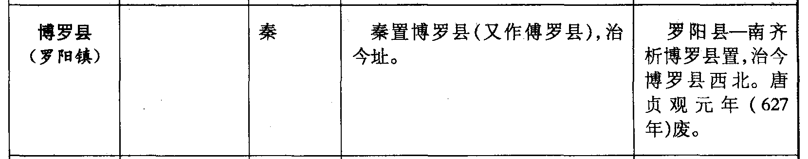 博罗县(罗阳镇)秦秦置博罗县(又作傅罗县),治今址。罗阳县—南齐析博罗县置,治今博罗县西北。唐贞观元年(627年)废。