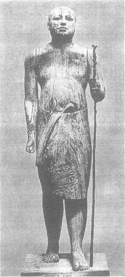 这件卡珀尔像就是以无花果木雕刻的,像高1米,属于古王国第四王朝,距今4000多年,是世界上现存最古老的木雕之一。对于这件雕像的身份,其说不一,一说是皇太子,一说是王公大臣。这是一位中年男子,长得圆头圆脑。他昂着头,目视前方,显出 一副傲慢的神情,拖着笨重的身躯,拄着手杖徐徐而行。这件作品虽然没有脱出埃及雕刻固定的程式,如人物头部、上身与躯干依然保持一种垂直状态、左脚向前等等,但由于雕刻家对于人物的细微观察、深刻理解,对于人物形体与精神的把握,使这件作品十分逼真,活灵活现地塑造了一个无所作为的贵族形象。据说,当这件作品破土问世时,当地农民惊奇地说: “这多么像我们的老村长啊!”以后,此像以《老村长像》闻名于世。