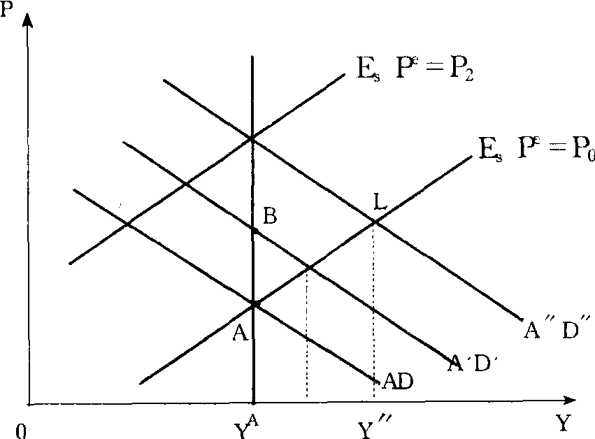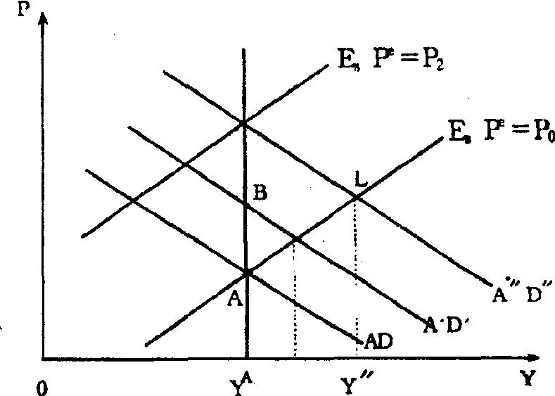 | 释义 | 卢卡斯供给曲线由理性预期学派的代表人物——芝加哥大学的罗伯特·卢卡斯首先提出的总供给曲线。总需求 (AD) 曲线的位置既受到意料之中的、又受到意料之外的因素的影响。由于意料之中的原因而造成的总需求的变动只能使价格水平上升或下降,并不能导致整个经济波动以及就业量或产量的变动;而意料之外的原因造成的总需求的变动却可以导致就业量或产量的波动,而且是经济波动的唯一原因。由此,卢卡斯认为,由于经济政策是意料之中的公开的政策,所以并不能维持经济系统的稳定。即使这些政策是有效的,若属于意料之外的因素,国家经济管理人员也无从执行。如图所示,点A是经济社会的起始状态,A′D′和A″D″分别是由于意料之中和意料之外的因素造成的总需求的变动,B、L两点分别是两种情况决定的价格P和产量Y,两种状态下的预期: 意料之中预期变为Pe=P2,意料之外预期不变,仍为P0。由此说明了理性预期学派的最终结论:宏观经济政策是无效的。卢卡斯曲线是该学派用以反对凯恩斯主义的重要工具。