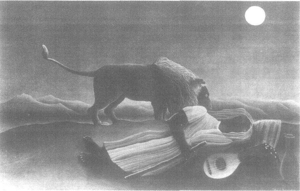 | 释义 | 卢梭《熟睡的吉普赛少女》 卢梭《熟睡的吉普赛少女》在 一片人迹罕至的荒漠之中,一位弹奏曼陀铃的黑人少女,好像四处流浪来到这里。她把陶土烧壶(烧壶里面装着吉普赛人的饮水)放置一旁,大概由于走得太倦了,便躺下来休息。她很快就进入了梦乡。此时素月流天,澄辉蔼蔼,一头狮子刚巧打这儿经过。它摇着尾巴,头伸向少女,嗅着她的气味。少女身上东方款式的衣裙,在绰约闪烁。